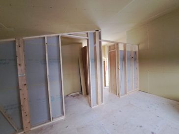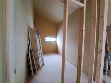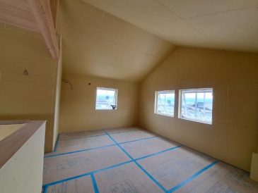 おうちの外周部の壁に断熱材をしっかりと充填されていることを確認した後は、外周部の壁にプラスターボードを貼っていきます。