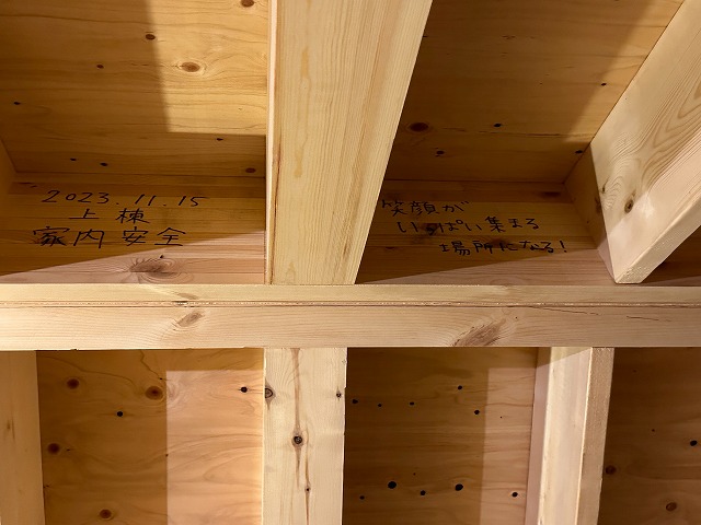 「ぜひお願いします!」とお答えして、棟木(屋根の一番てっぺんの木材)へお家づくりの想いをつづっていただきました!