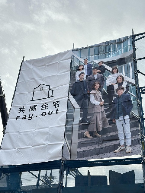 体を温めようと、ヘルメットをかぶり、足場にレイアウトの看板シートを張ってみました!