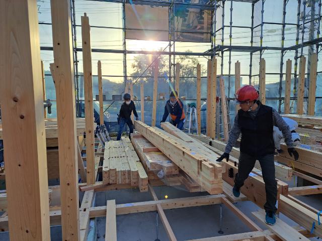 2階の床が貼れたら、2階の柱を建てていきます(*’▽’)