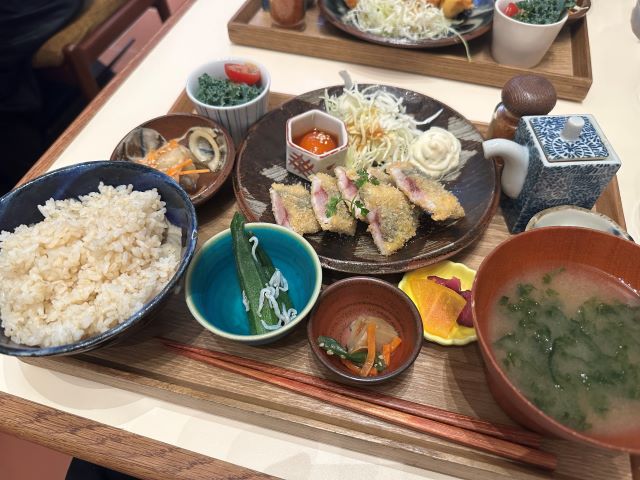 レアアジフライ定食です。お米は玄米で健康にも気を使った定食でした。