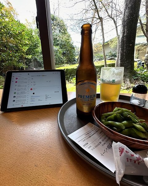 お風呂上りに、ノンアルコールビールで、庭を眺めながら、