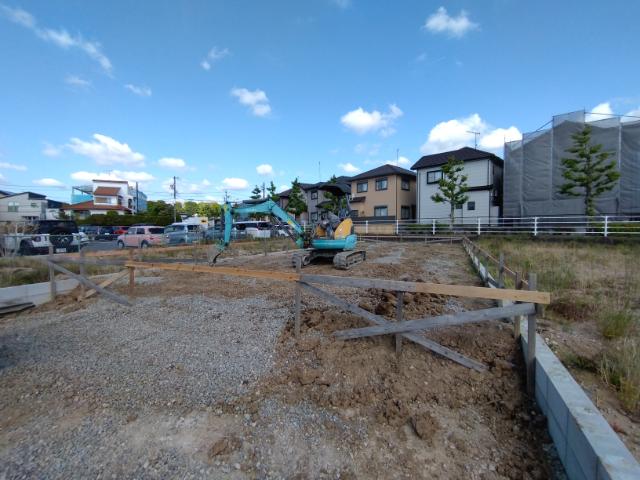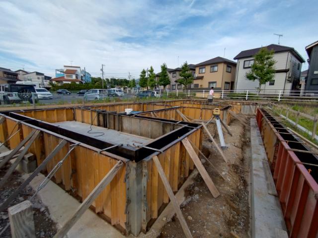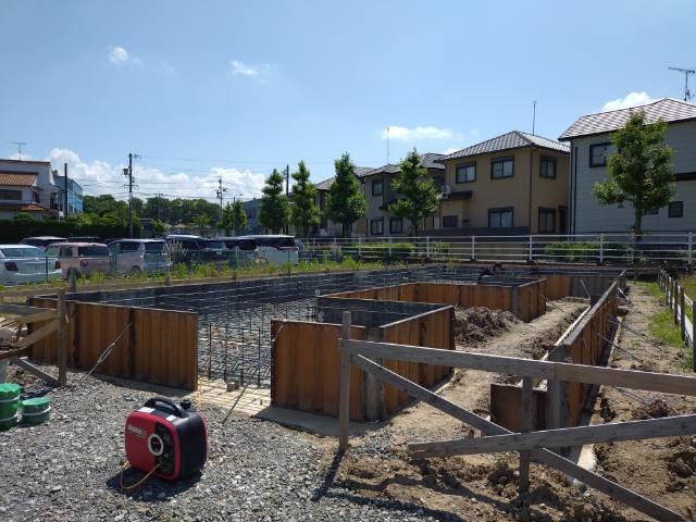 基礎の高さや配置を決める丁張を基礎屋さんに設置していただき、重機を使って基礎の形に土を掘ってもらいまして、
