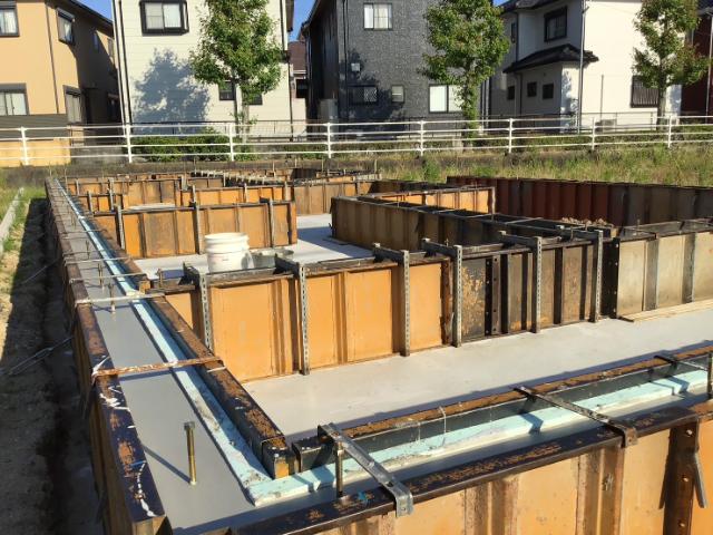 基礎の床の部分のコンクリートを打って、立ち上がりの基礎の型枠を起こしていきます。