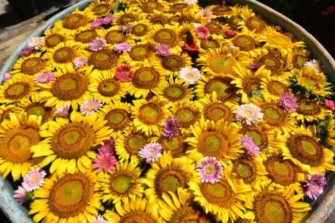 園内に入ると直径1m程の桶にヒマワリたちが敷き詰められてた花桶?が出迎えてくれました(^^♪