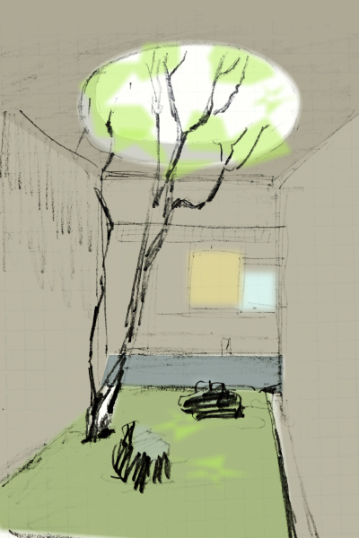 その苔の中から黒い木の幹が伸び、丸くくりぬかれた天井から空へ枝葉を伸ばしています。