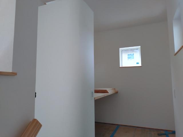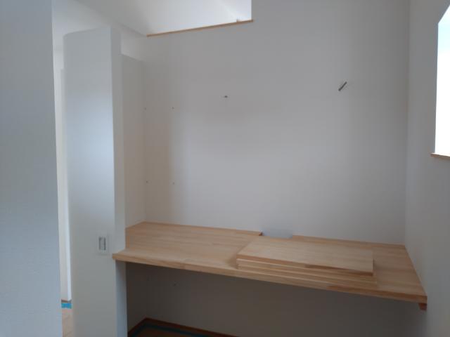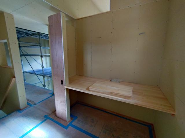 只今クロス工事が完了したところなのですが、楽しみにしていた書斎のカウンターの完成が見えてきたのでとてもうれしいです!
