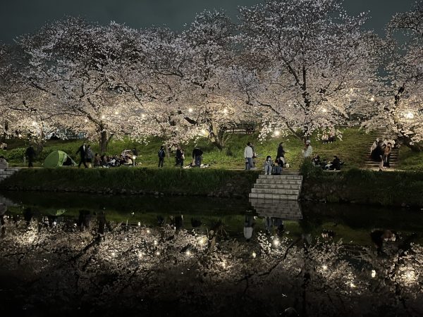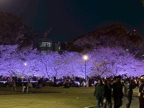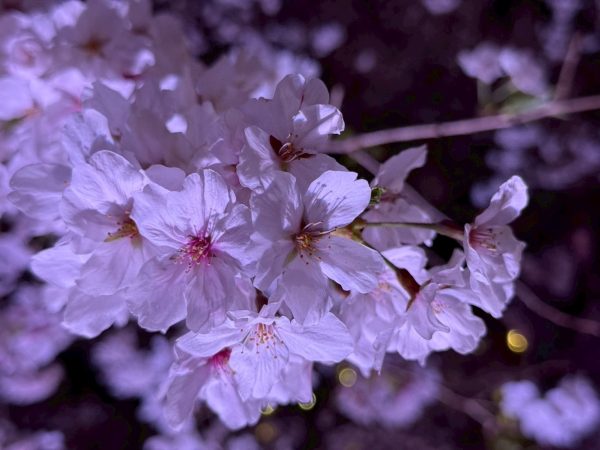 ただ、近くで見ると、青白いライトのほうが、桜本来の白っぽい、薄いピンクにみえてそれもまた素敵です。