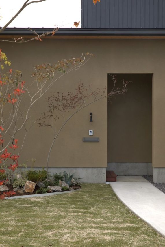 家のアプローチに合うよう、樹形が斜めの植栽を採用しました。