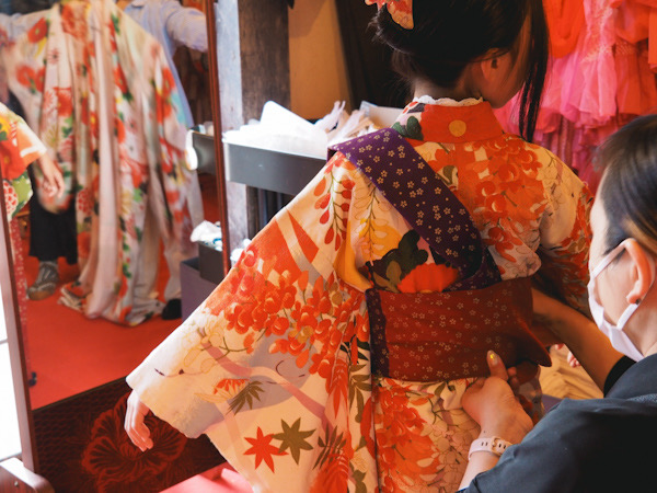 この期間中、こどもたちはお店で着物をレンタルして足助の町を”おひなさんぽ”できる楽しみがあるんです。