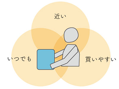ヒトは行動するとき「近い、行きやすい」「いつでも手に入る」「買いやすい価格」の3つのことを総合的に評価しているようだという研究結果があります。